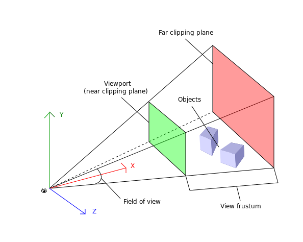 视野fov,近剪裁平面(视口),远剪裁平面,视见体